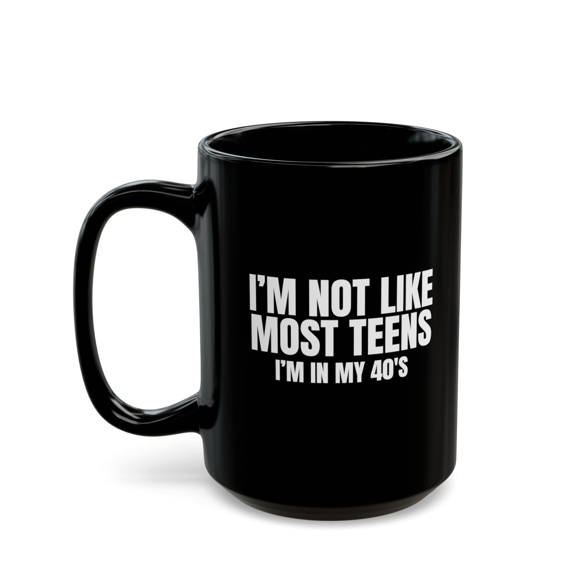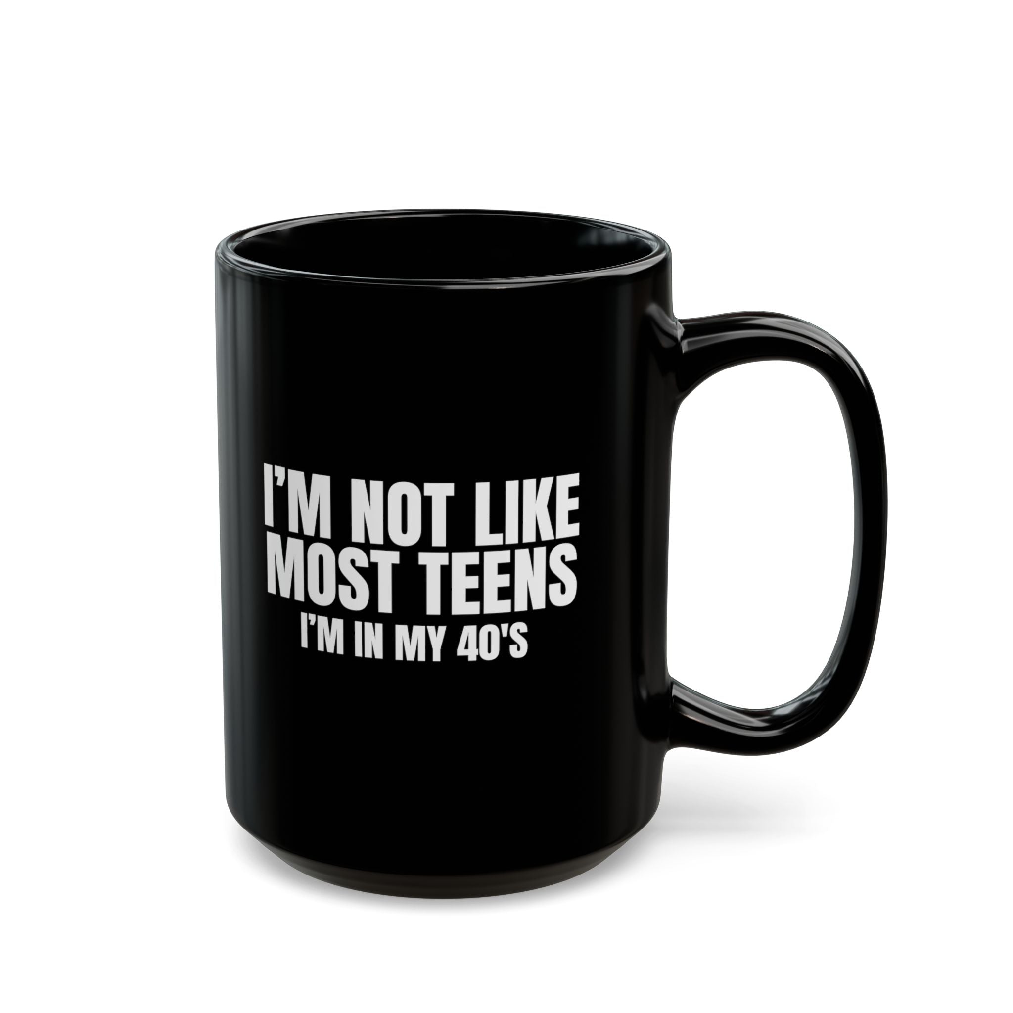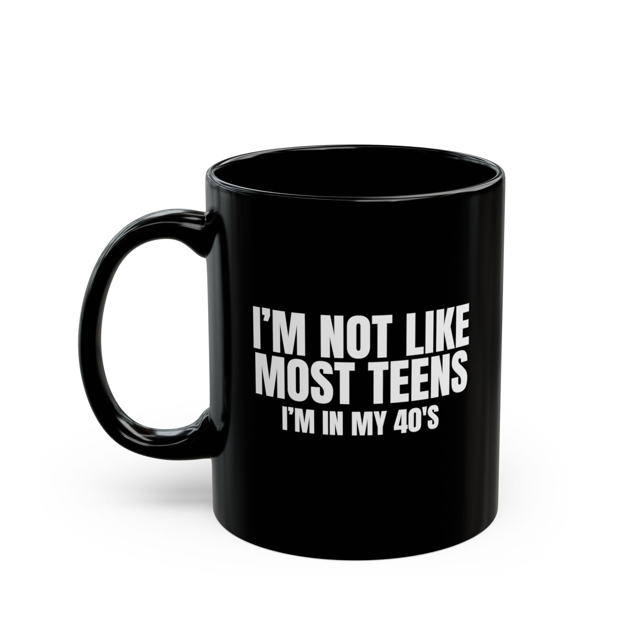 This glossy black ceramic mug carries a bold, white statement that reads “I’m not like most teens — I’m in my 40’s,” blending humor and personality into a morning ritual. The deep black finish makes the text pop, giving the design a modern, minimalist punch. Choose 11oz for a standard coffee portion or 15oz when you want an extra pour. Durable, microwave- and dishwasher-safe, it’s built for everyday use and keeps its vibrant print through regular handling. Comfortable C-shaped handle and lead- and BPA-free ceramic give peace of mind along with personality.