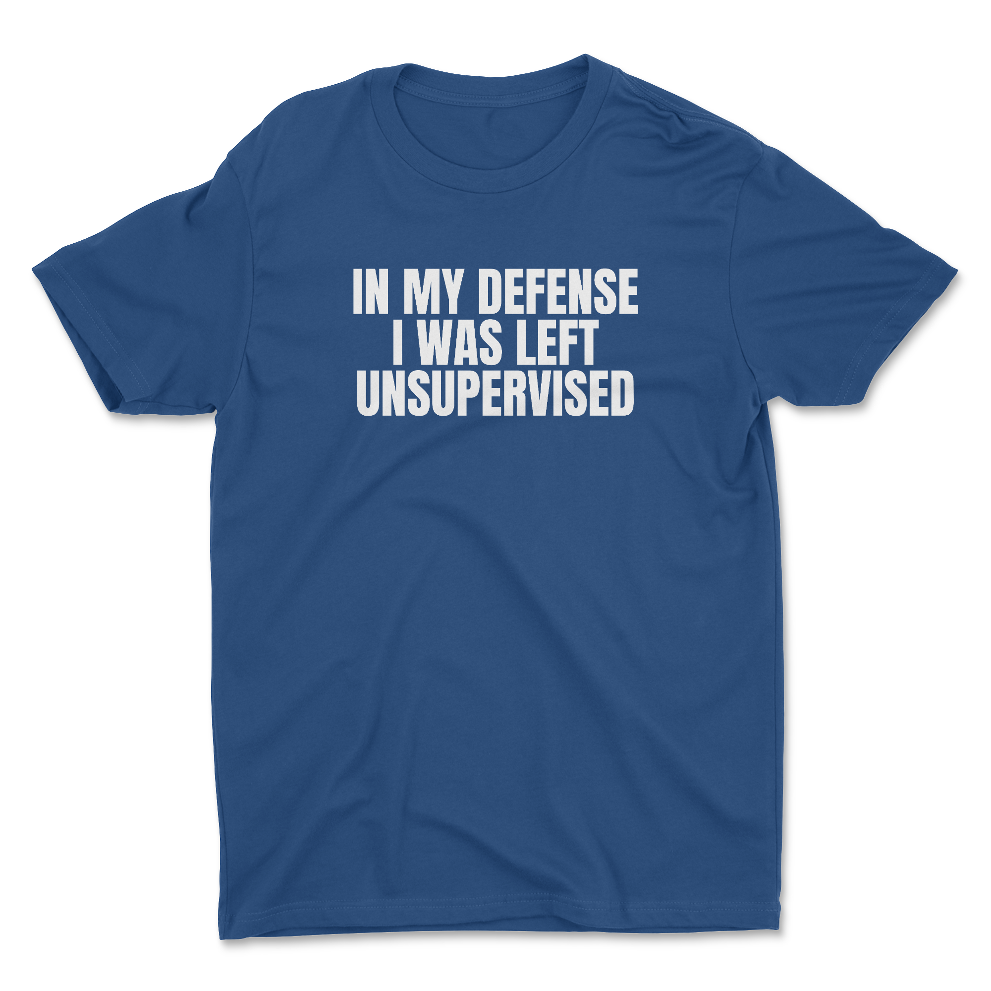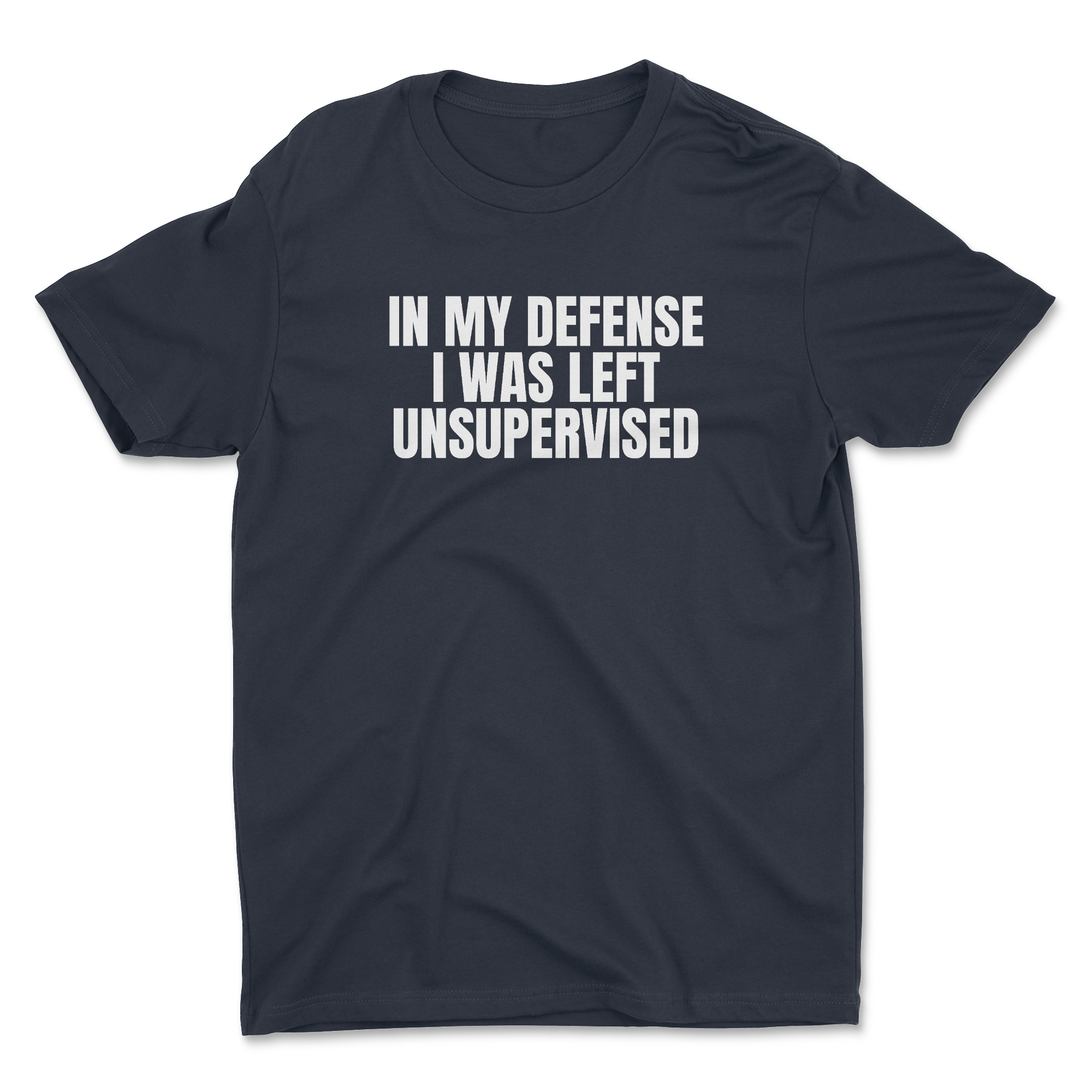 This lightweight cotton crew shirt carries a bold, tongue-in-cheek message: “IN MY DEFENSE I WAS LEFT UNSUPERVISED.” It sits cleanly across the chest in crisp white on a deep black tee for high-contrast, easy readability. Slip it on for errands, late-night hangs, or low-key weekend plans — it moves with you and keeps its shape thanks to shoulder tape and a ribbed knit collar. The classic fit and crew neckline make it simple to layer under a jacket or wear on its own. Made to last: side seams for structure, DTF sleeve-print options, and EU-compliant materials finished in Honduras.