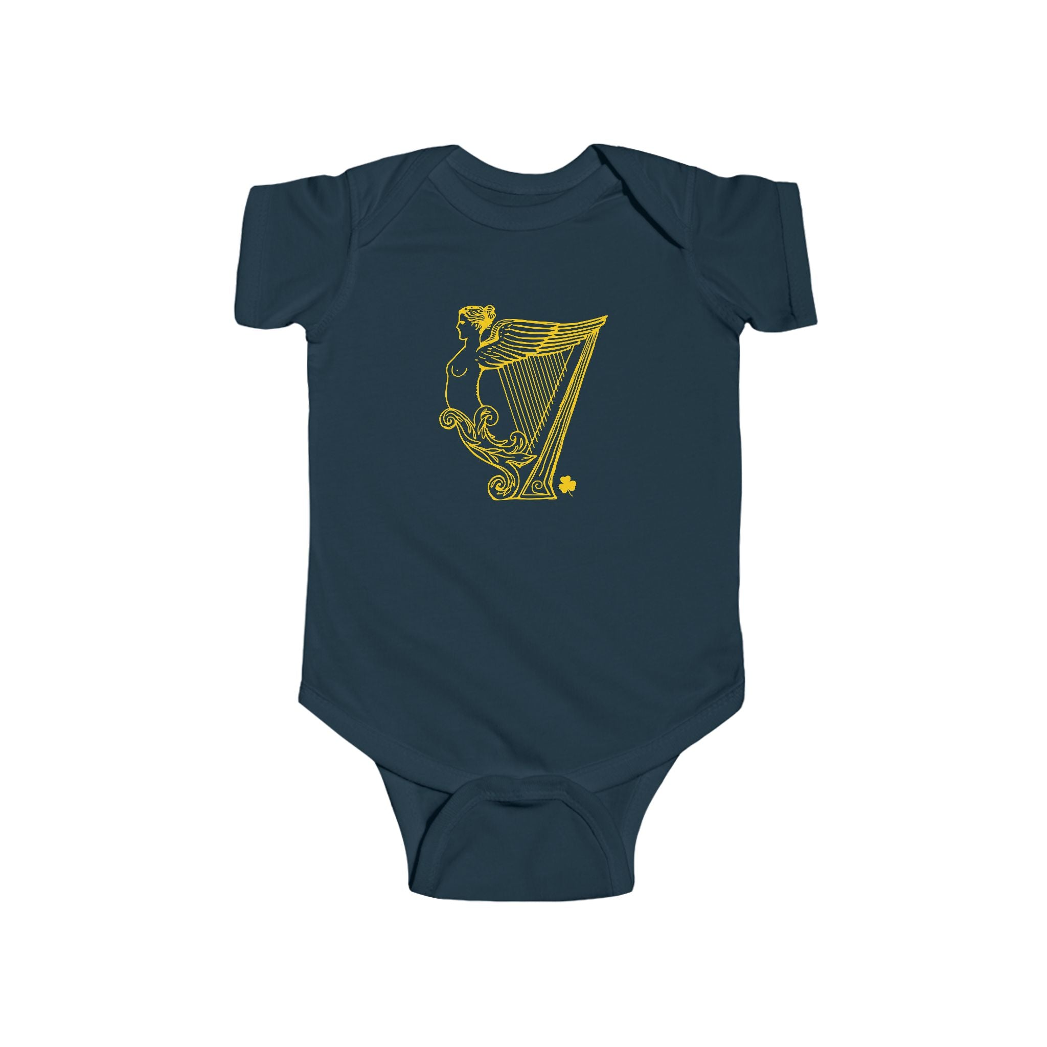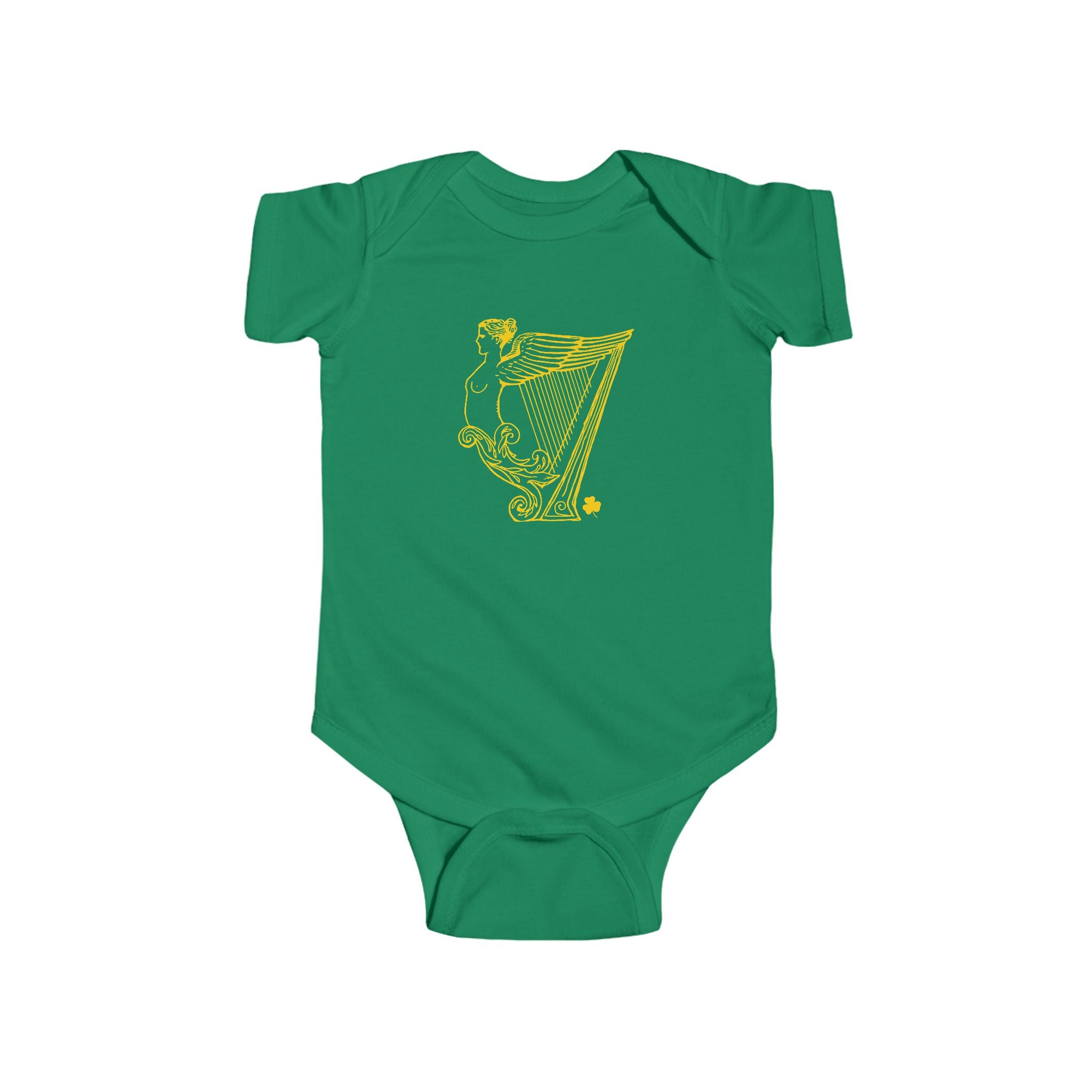 Soft, lightweight bodysuit with a playful vintage-style, irish harp print. Designed for little ones who join in the St. Patrick’s Day fun, this bodysuit feels gentle on baby skin and moves with them thanks to ribbed knit binding and a stretch-friendly cut. The tear-away label and matching plastic snaps at the cross closure make dressing fuss-free. Breathable combed ringspun cotton keeps baby comfortable during playtime and family gatherings, while the reinforced side seams help the garment hold its shape wash after wash. A cozy, cheerful piece that layers easily under sweaters or pairs with tiny jeans for a seasonal look.