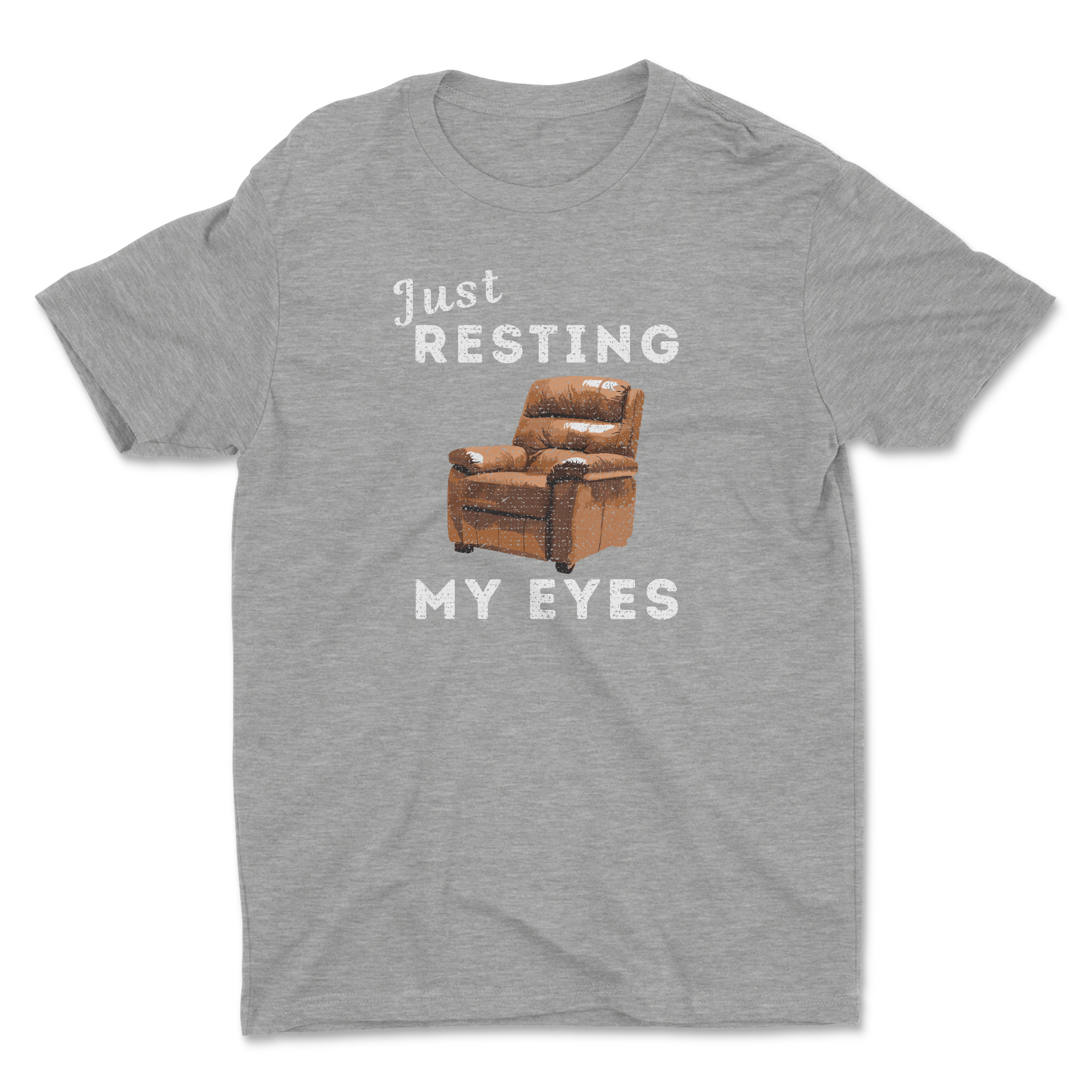 This lightweight crew tee carries a playful, cozy attitude — a soft dark tee stamped with a worn-leather recliner and the phrase “I'm Just Resting My Eyes.” It reads like a wink to the laid-back life: afternoons on the couch, slow weekend rituals, and the kind of tired satisfaction that comes after a long week. The classic crew cut and clean silhouette make it easy to layer under a flannel or wear solo while you settle in with a book or stream your favorite show. The printed recliner graphic feels tactile and homey, turning a simple shirt into a personal little statement about comfort, downtime, and gentle humor.