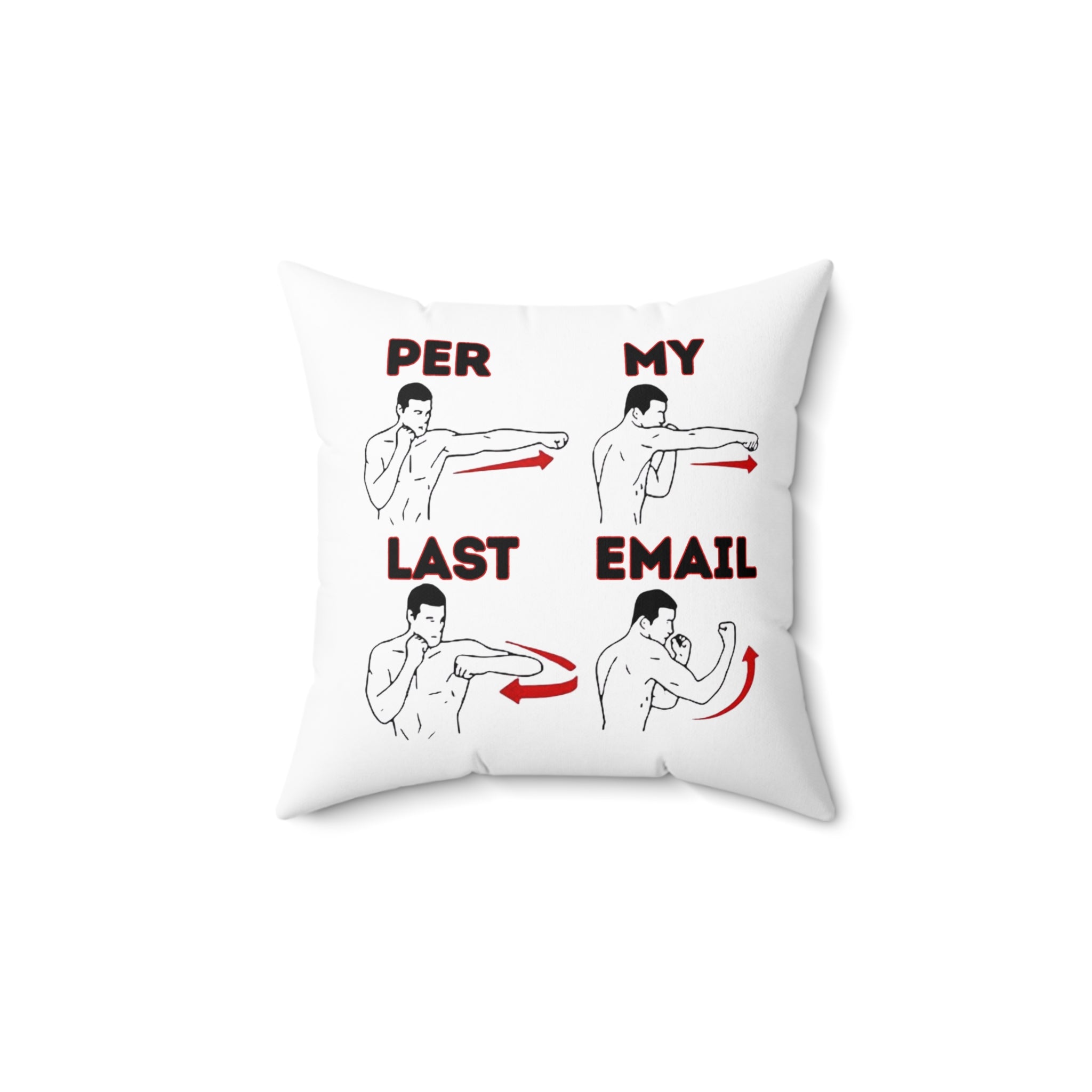 A playful, square throw pillow that brings a wink of office humor to couches and home workspaces. The double-sided print shows a comic-style sequence of a boxer throwing punches paired with the cheeky phrase split across the panels — a lighthearted nod to that victorious feeling when you finally hit "send" on a long email. The spun polyester cover keeps the design crisp and wrinkle-free, while the recycled polyester insert ships vacuum-packed and expands to give the pillow a full, plump look when assembled. Tuck it on a sofa, lean into it at your desk, or let it spark conversation in a shared living room — it’s a small, durable accent that carries a quiet, relatable laugh for anyone who lives in inbox rhythms and punchline timing.