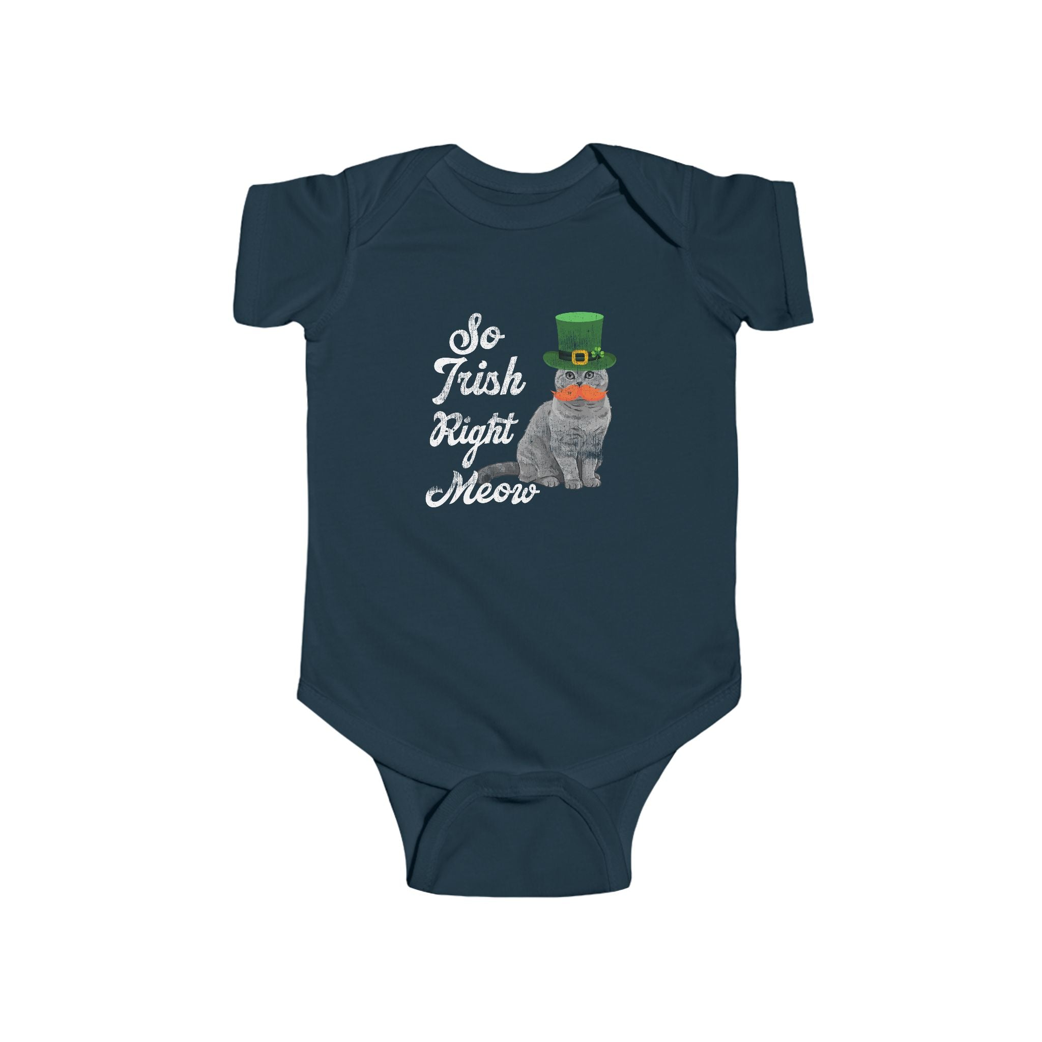 Soft, lightweight baby bodysuit in bright shamrock green, printed with a charming “So Irish Right Meow” design featuring a tiny leprechaun hat and a fluffy kitten. The smooth, tightly spun fabric feels gentle on delicate skin and lays flat for clear, crisp printing. Side seams and ribbed knit binding give the onesie subtle structure and stretch where babies need it most. Snap closures at the crotch make diaper changes quick and fuss-free. Thoughtfully made with tear-away labeling and REACH-compliant materials, this piece blends playful Irish charm with everyday practicality for little ones. Product features - 100% combed ringspun cotton for solid colors; heather blends vary for softness and durability - Lightweight 4.5 oz/yd² fabric — breathable and gentle on baby skin - Side seams and ribbed knit binding for shape retention and flexible movement - Matching plastic snaps at the crotch for easy diaper changes; tear-away label for comfort - REACH certified materials; made in India with specially spun fibers for smooth, high-quality printing Care instructions - Machine wash: cold (max 30C or 90F) - Non-chlorine: bleach as needed - Tumble dry: low heat - Do not dry clean - Do not iron